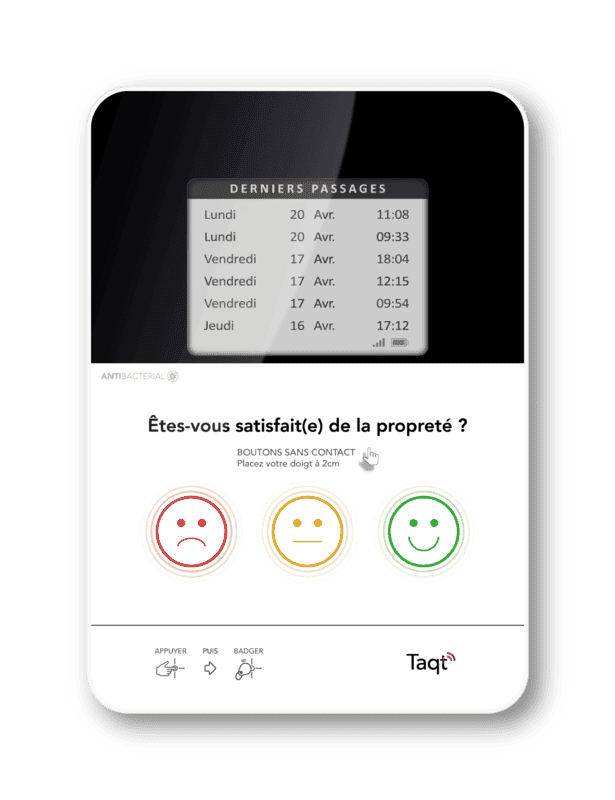 En plus de l'affichage du dernier passage et du suivi des interventions par badge, le modèle Smile propose 3 boutons "Smiley" permettant aux usagers de donner leur niveau de satisfaction sur une prestation.