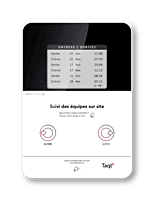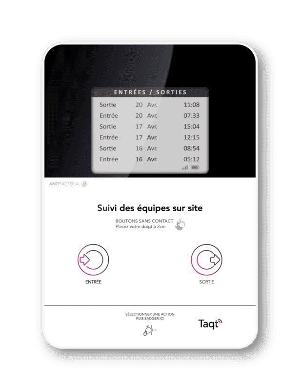 En plus de l'affichage du dernier passage et du suivi des interventions par badge, le modèle Time propose 2 boutons permettant de signaler l'arrivée et le départ d'une personne en combinaison avec le passage du badge, permettant ainsi de mesurer le temps passé par chaque intervenant à l'endroit où la borne est positionnée.