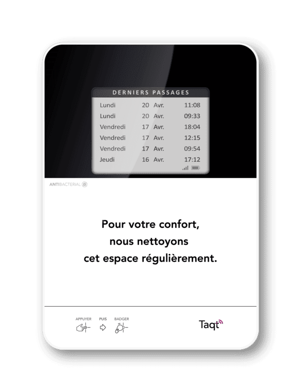 La TaqtOne est une borne connectée sans fil conçue pour suivre l'activité de vos équipes sur site : nettoyage, maintenance, pointage, mesure de satisfaction client...